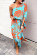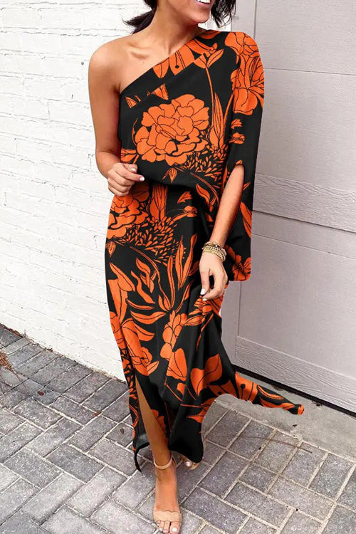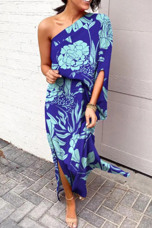 Lilliagirl Fashion Printed Oblique Shoulder Single Sleeve Long Dress