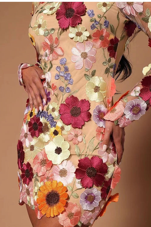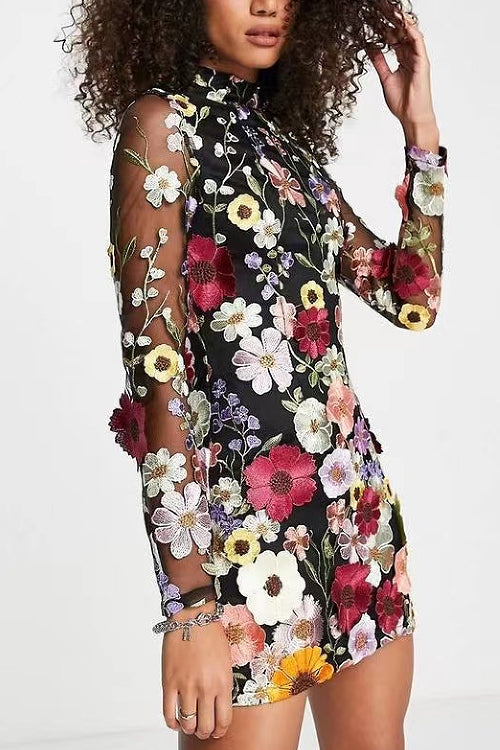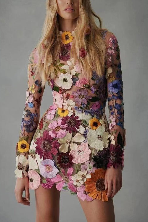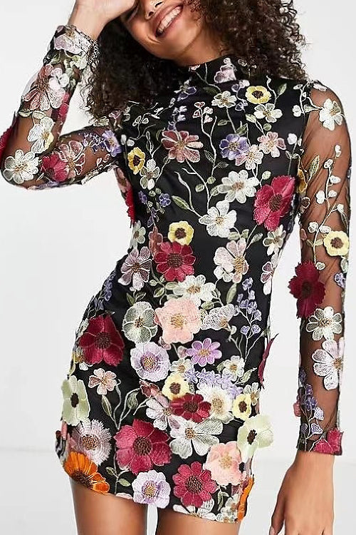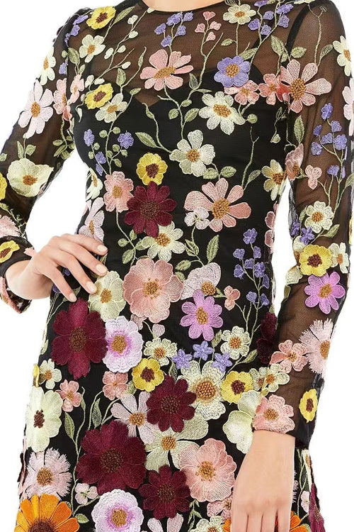 Rowanggirl Fashion Three-Dimensional Embroidery Flower Long-Sleeved Dress